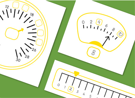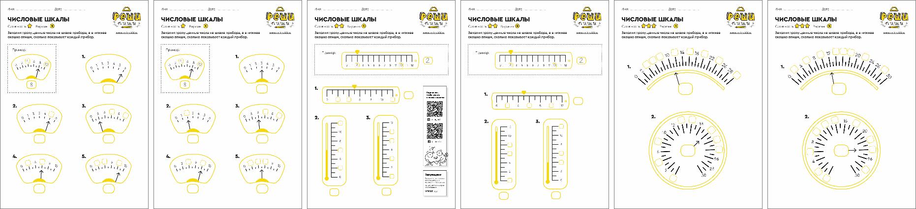 На шкалах стёрлись некоторые числа, нужно восстановить их и понять, сколько показывает каждый прибор. Задание развивает представление числового ряда и навык письма.