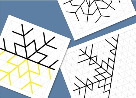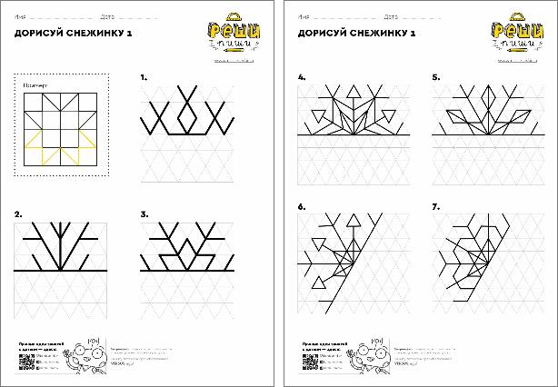 Нужно дорисовать недостающие части симметричных снежинок. Дети осваивают понятие симметрии, учатся точно проводить линии, оценивать размеры, количества клеточек.