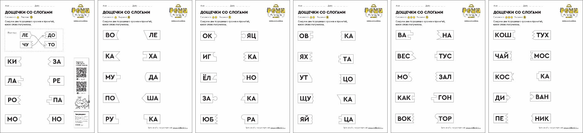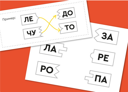 Тренируем чтение по слогам. В задании нужно соединить два подходящих кусочка и прочитать, какое слово получилось.