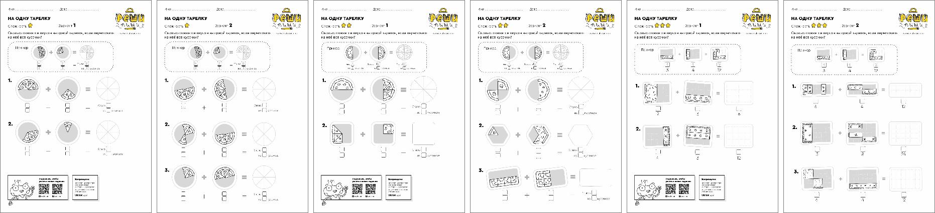 Сколько окажется пирога на тарелке, если переложить на неё все кусочки? В этих заданиях ребёнок на наглядном примере разберётся в сути дробей и их числовом обозначении.