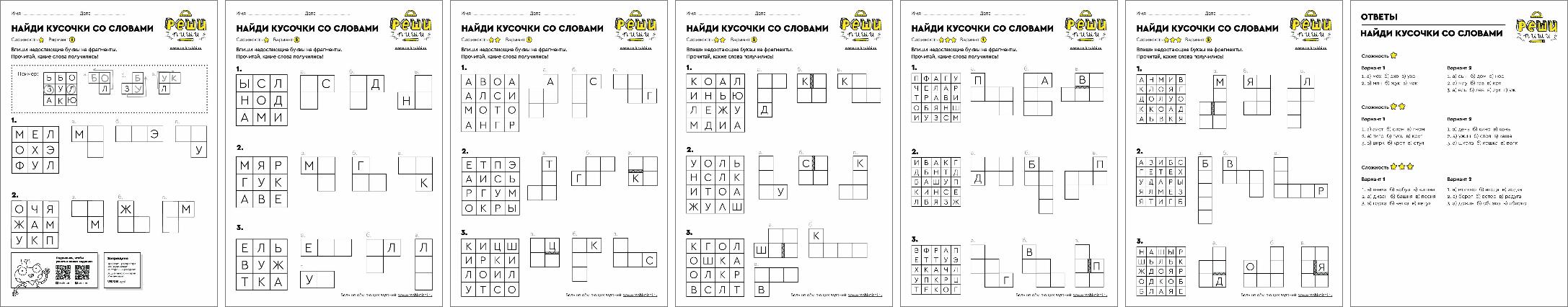Задание тренирует внимательность, знание букв, чтение и письмо. Нужно вписать недостающие буквы на фрагменты и прочитать получившиеся слова.