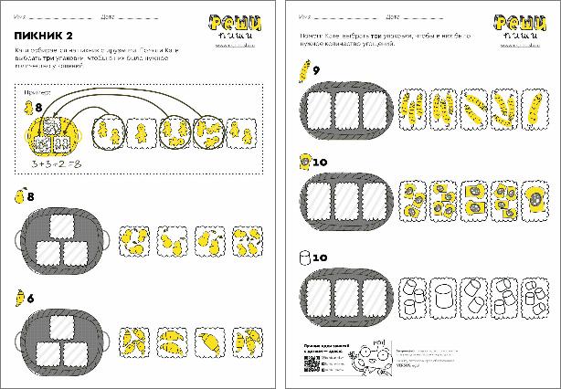Помогаем Кате собраться на пикник и тренируем состав числа на аппетитных печеньках, яблоках и сосисках. Уровень 2.