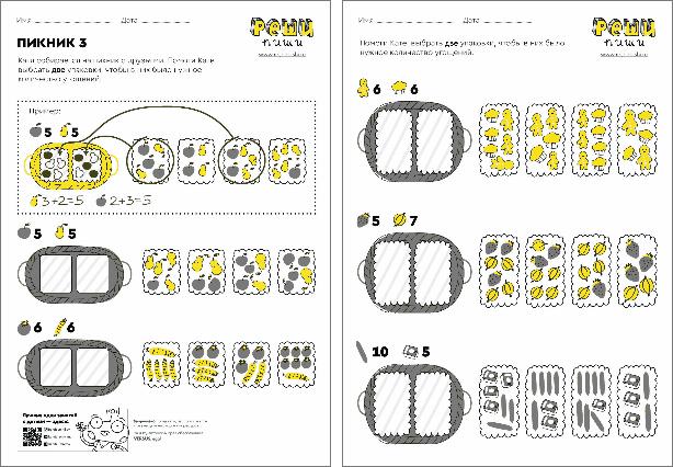 Помогаем Кате собраться на пикник и тренируем состав числа на аппетитных печеньках, яблоках и сосисках. Уровень 3.