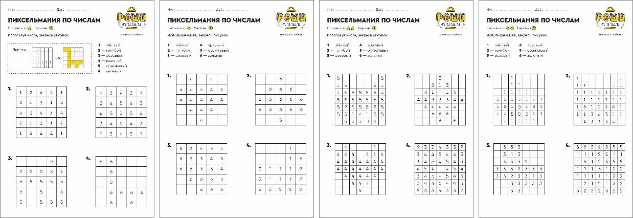 В этих раскрасках зашифрованы картинки. Ключом к их расшифровке служат числа. Используя их, нужно закрасить клетки соответствующим цветом.
