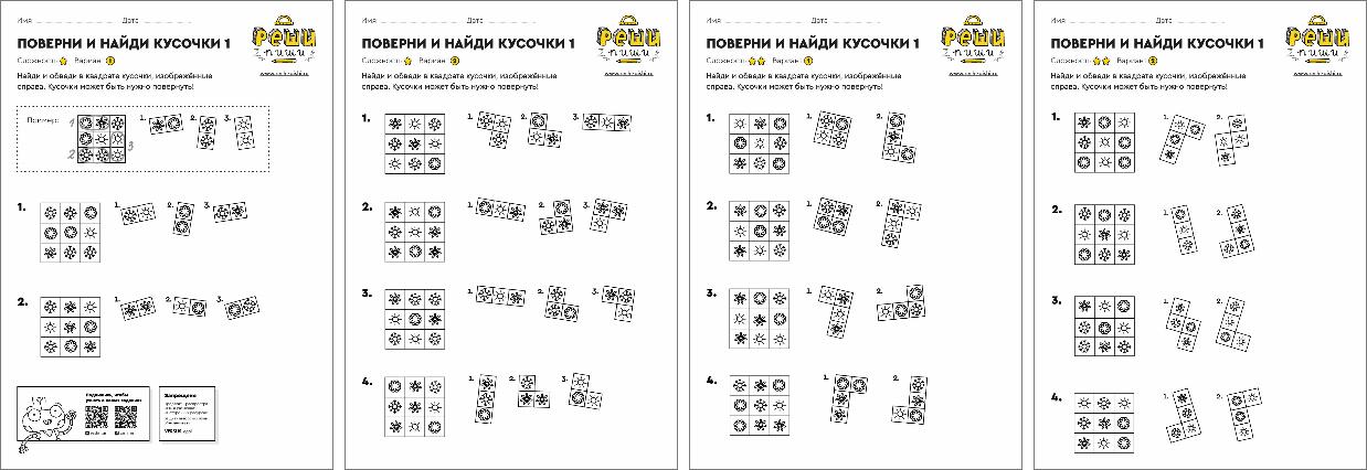 Задание тренирует внимательность, умение сравнивать и соотносить объекты между собой. Среди множества рисунков нужно найти и обвести в квадрате кусочки, изображённые справа. Некоторые из них придётся повернуть.