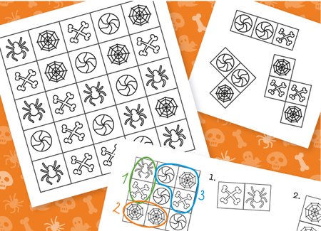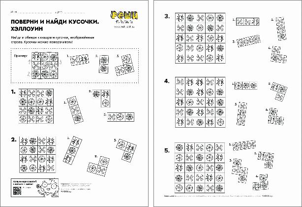 Задание тренирует внимательность, умение сравнивать и соотносить объекты между собой. Среди множества рисунков нужно найти и обвести в квадрате кусочки, изображённые справа. Некоторые из них придётся повернуть.