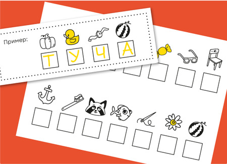 Разгадайте слова: для этого впишите в ячейки первые буквы названий предметов. Задание тренирует умение соотносить звуки с буквами.