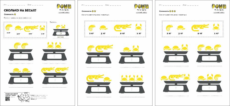 Взвешиваем животных и занимаемся арифметикой. В этих заданиях ребенку нужно не просто сложить числа, но и соотнести силуэт животного с его весом.