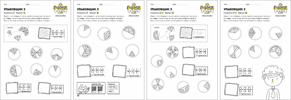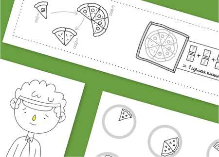 Из разных кусочков пиццы нужно собрать целую и записать пример. Задание наглядно показывает, что в «одной целой» может быть сразу ½, ¼ и две ⅛ .