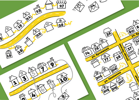 Нужно помочь почтальону доставить письма верным адресатам. Почтальон совсем запутался: ведь на некоторых домах нет номеров!